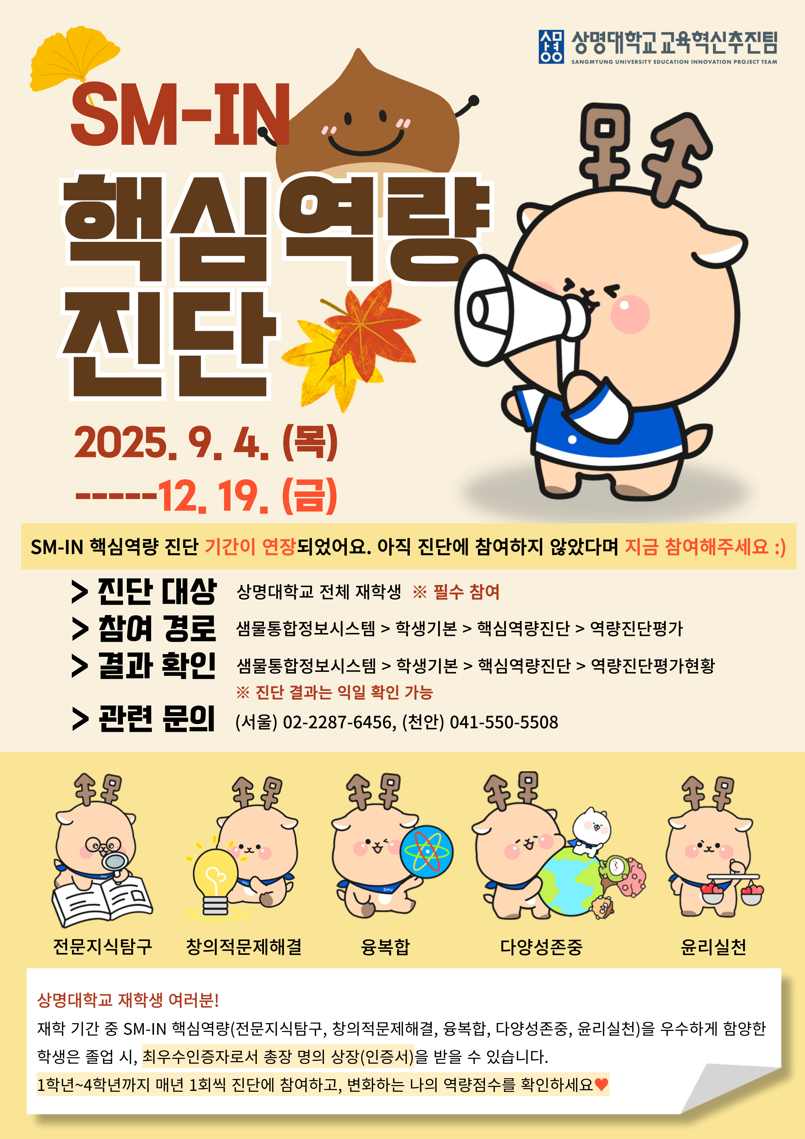 | 상명 [학생생활] | [교육혁신추진팀] 2025학년도 전체 신입생 대상 SM-IN 핵심역량 진단 기간 연장 |